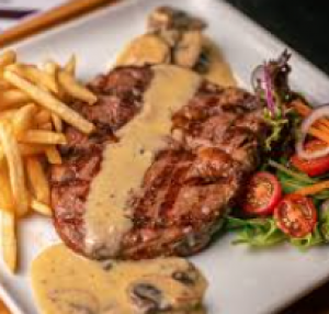 Steak Daging Import Dipanggang Dengan Pelengkap Ketang Tumbuk, Campuran Sayuran, Dan Disajikan Dengan Saus Jamur