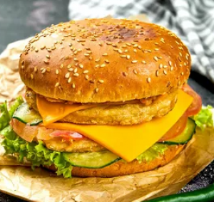 Roti Burger Diisi Dengan Daging Ayam Saus Keju Dan Keju Slice